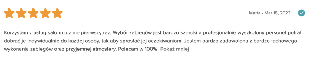 "Jestem zachwycona efektami! Nawet treningi na siłowni nie dały mi takich efektów! Dodatkowo w gabinecie panuje bardzo przyjemna i luźna atmosfera. Pani Renata to nie tylko przesympatyczna osoba, ale przede wszystkim bardzo kompetentna. Wykorzystuje tylko najlepszy sprzęt i wykonuje swoją pracę z wielką pasją. Dla mnie to 10/10!"